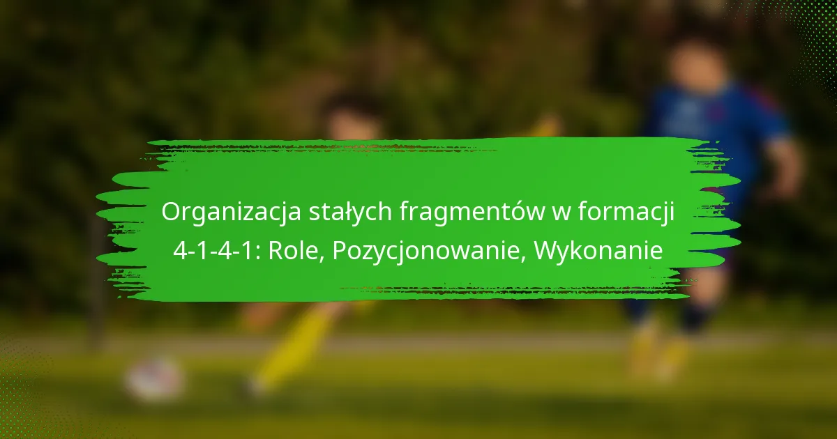 W formacji 4-1-4-1 organizacja stałych fragmentów gry obejmuje jasno określone role dla każdego zawodnika, aby maksymalizować solidność obrony i potencjał ataku. Kluczowe role obejmują bramkarza, obrońców, pomocników i napastników, z których każdy ma określone obowiązki podczas stałych fragmentów gry.